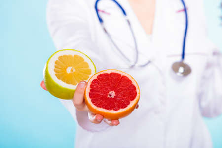 Health concept. Nutritionist doctor holding fruits grapefruits in her hand on blue. Dietitian recommending healthy food. Diet.
