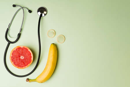 Going to the doctor because of sexually transmitted diseases. Stethoscope with an open condom, banana and grapefruit