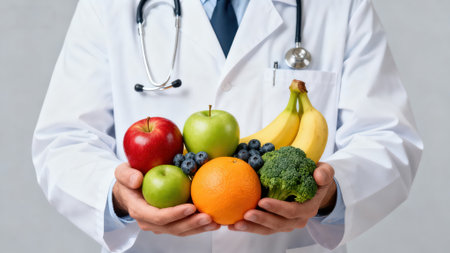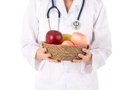 Healthy eating and dieting concept. Doctor holding fruits and vegetables