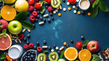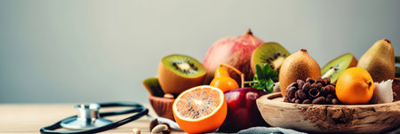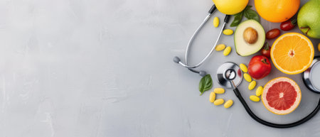 Fresh fruits, vegetables, pills, and stethoscopes on a gray background symbolizing health, nutrition, and medical care.