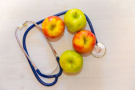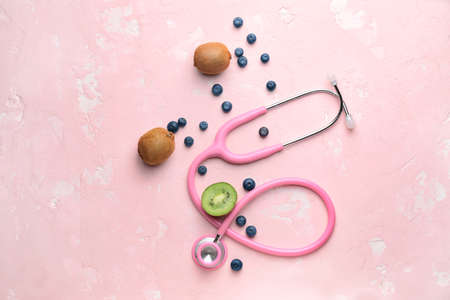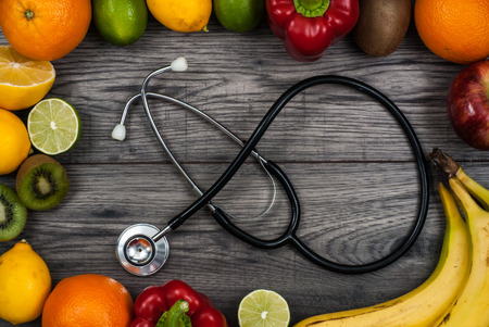 Nutrition and healthy eating. Fruits, vegetables, juice and stethoscope