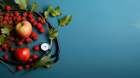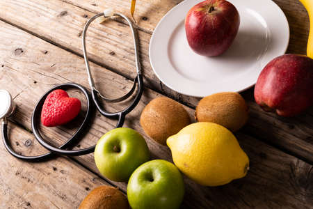 Fitness concept with fruit and stethoscope. Top view background concept.