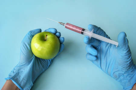 Injection into an apple. A hand in a medical glove with a syringe on a blue background. Genetic modified foods. Injection of GMOs.
