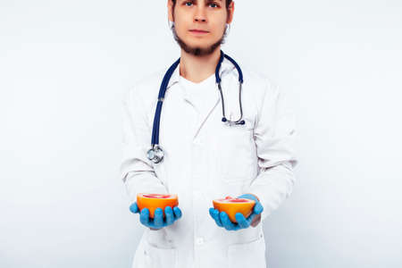 Medicine concept doctor. Diet and proper nutrition. Vitamin orange ripe. On a white brick wall background. Keeps the fruit. In the profile. Photo for your design