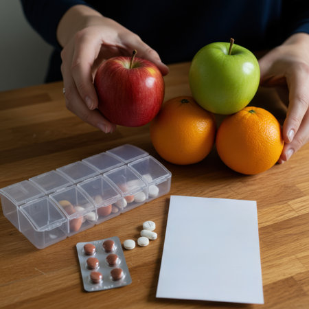 Doctor nutritionist offers patient to choose between healthy fruit or pills