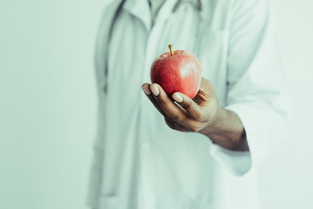 Closeup of black male doctor holding and offering red apple. Healthy nutrition concept. Isolated front view on white background.