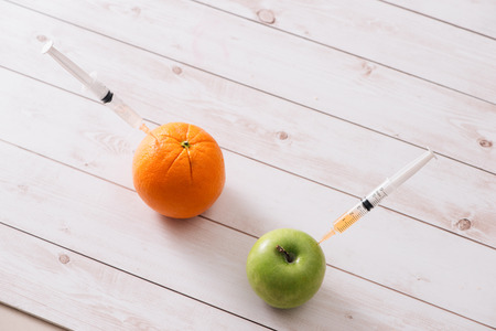 Genetic modification concept. Human hand holding fruit and syginge. Apple receiving an injection of some substance for rapid ripening.