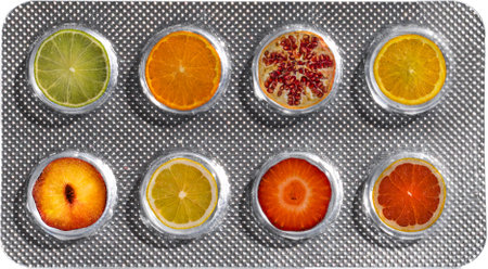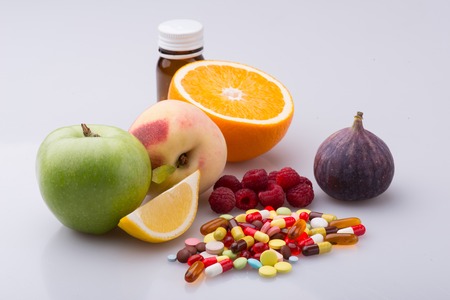 fresh natural fruits vs pills. Natural vitamin in fruits vs synthetic vitamin in pills with copy space. Choice between natural and synthetic way of health care. Alternative medicine. Closeup