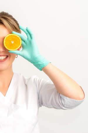 Portrait of young caucasian smiling female beautician covering eye with an orange slice wearing gloves over a white background