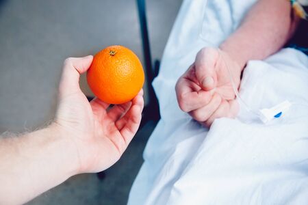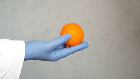 doctor's hand holds an orange against the patient's background. Concept treatment of oranges with vitamin C - useful fruit for health.