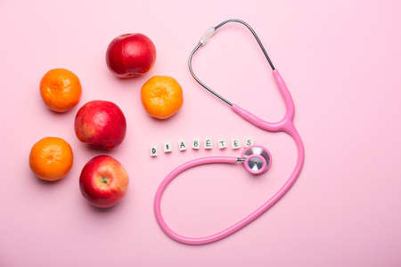 Digital glucometer, lancet pen, stethoscope and fruits on color background. Diabetes concept