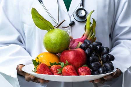 Doctor holding a plate of fresh fruits healthy diet concept.