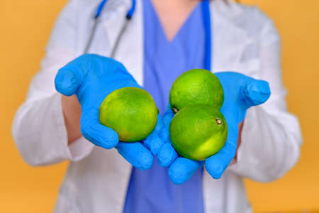 A female doctor holds a lime fruit in her hands, yellow studio background