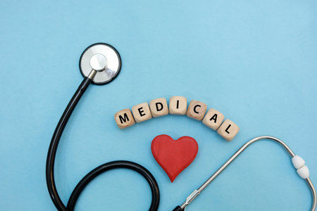 Medical text from wooden cubes. White backdrop blue background. Studio