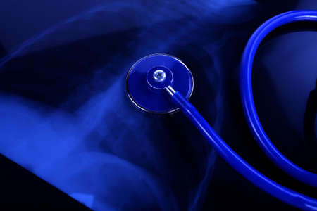 Tuberculosis treatment concept. X-ray of the lungs, with pathology, phonendoscope with pills on the table. Lung disease. Pneumonia. Medical flatley, pills and x-ray image, with phonendoscope, on a blue background. The treatment of bronchitis. Chemotherapy