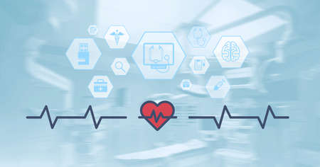 Composition of heart rate monitor and network of medical icons over hospital. global online medicine and technology concept digitally generated image.