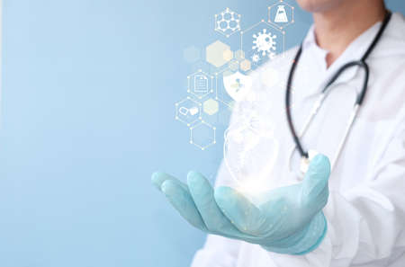 Doctor hand pushing button on virtual screen. Medical technology concept