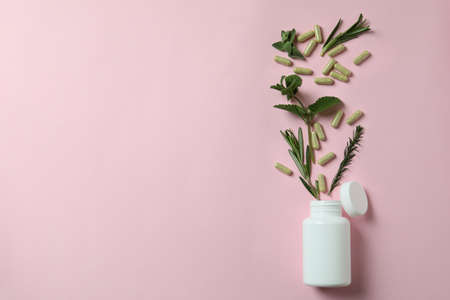Concept of herbal medicine pills on pink background, space for text
