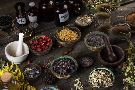 Natural remedy,Herbal medicine and wooden table background