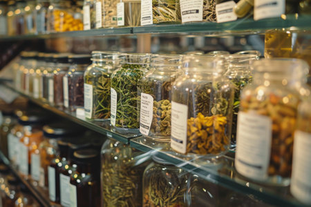 A shelf of glass jars filled with various herbs and spices. The jars are arranged in rows, with some of them labeled with the name of the herb or spice inside. Scene is one of organization