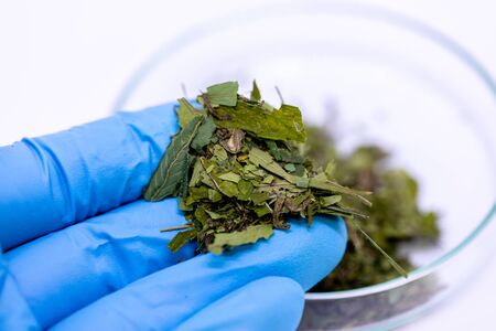 Study Structure of Marijuana leaves, Powder of Cannabis (Drugs) on a White background, For Analysis in laboratory.
