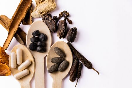 Herbal tablets in three wooden spoons with assorted Indian Spices on white background and copy space. Pneumonia treatment concept