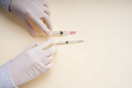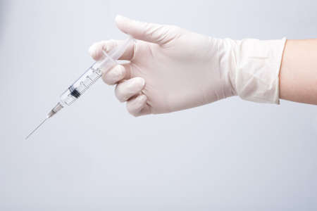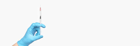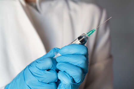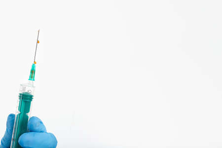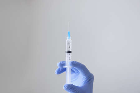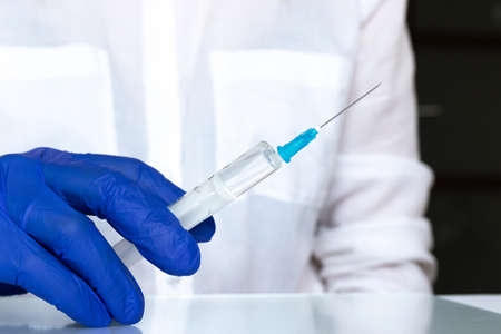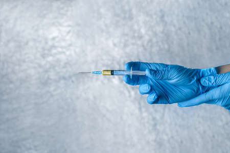 A doctors hand in a medical glove holds a syringe with a needle to protect against the flu virus. Cvd vaccine. The concept of medicine vaccination treatment with subcutaneous injections, copy space