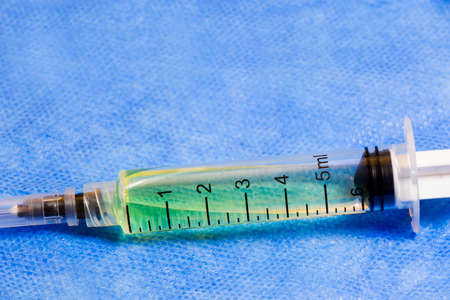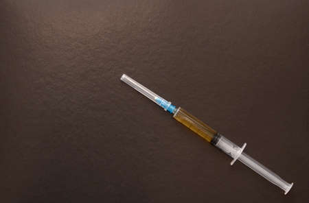 Medical needle on the sterile table with liquid vaccine, yellow vaccine for viruses. Vaccination and antibiotics. Studio shoot.
