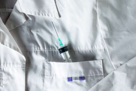 a syringe with a needle in the breast pocket of a white medical coat. High quality photo