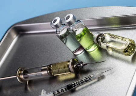 Syringe and ampoules for injection on a blue background.