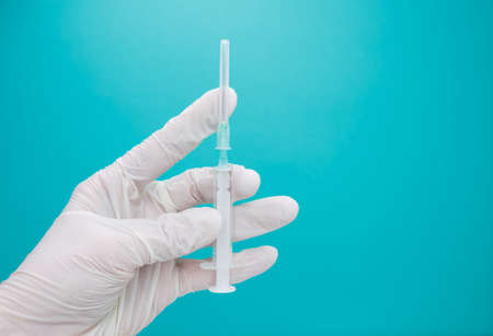 Hand with white latex glove and syringe with the vacuum for coronavirus epidemic, studio lighting with neo mint background. Coronavirus COVID-19 vaccine