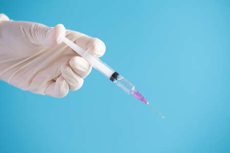 Close-up of a doctors hand in blue medical gloves holding a syringe with a medicine on a blue background