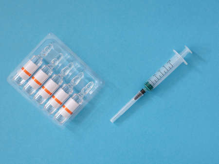 Disposable syringe and five glass ampoules in a blister on a blue background, close up, flatlay.
