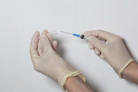 Doctor plastic gloves hand holding using two syringe isolate over white background.