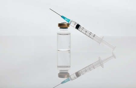 Glass bottle with vaccine and syringe for injection.
