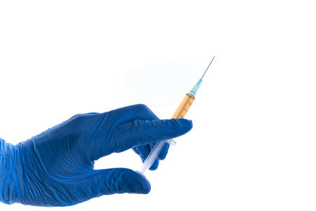 Gloved hand of doctor or nurse holding syringe with liquid vaccine before injecting over white background.Covid19, Coronavirus Concept. Flue shot