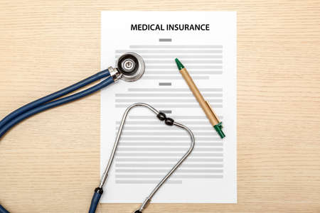 Health insurance form and stethoscope on wooden table. Health insurance concept.
