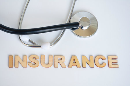 Top view of doctor's stethoscope with Insurance text on white background. Life insurance concept.