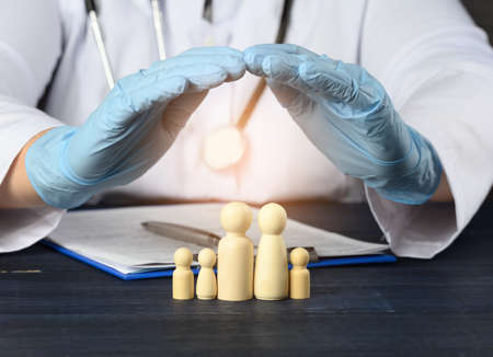 wooden figures of little men - a family, the doctor's hands cover the family for protection from diseases. Health insurance concept, doctor help