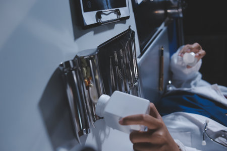 Close up of dentist busy operating surgery at hospital - concept of dental care, toothache treatment and profesional occupation.