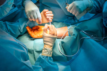 Team surgeon at work in operating room. Surgical light in the operating room. Preparation for the beginning of surgical operation with a cut. The surgeon is performing surgery on the patient.