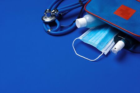 The set of a doctor for protection against coronavirus consisting of a mask, glasses, thermometer, syringes, ampoules and a stethoscope lying on a blue background in a studio