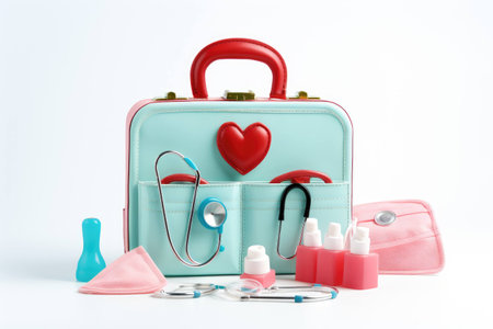 A visually appealing arrangement of first aid supplies and medical instruments on a bright turquoise background, ideal for showcasing emergency preparedness and health care essentials.