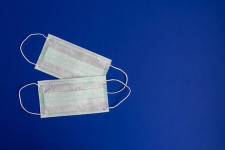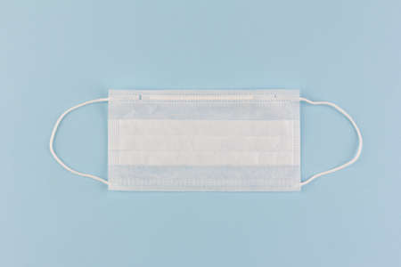 coronavirus COVID-19 pandemic. antiviral medical mask for protection against corona virus. Surgical protective mask. Medical respiratory bandage face on white background. quarantine, stay at home. on blue background