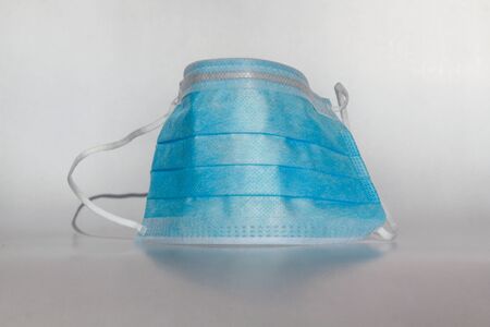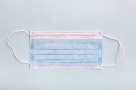 disposable medical mask on a blue background close-up , concept shortage of medical masks during the coronavirus COVIND-19 pandemic