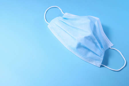 Medical protective mask on blue background. Disposable surgical face mask cover the mouth and nose.