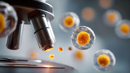 Microscopic view of a glowing cell under a microscope, symbolizing scientific research and biological discovery.
