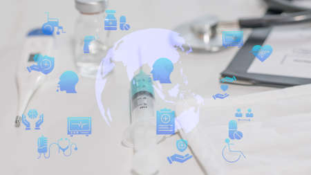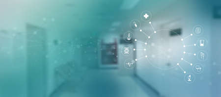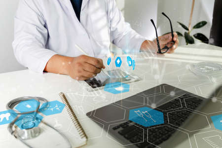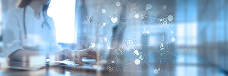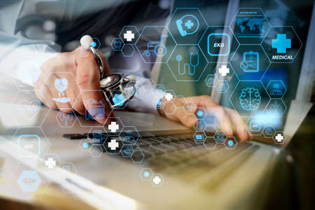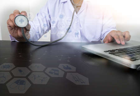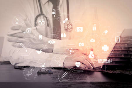 Medical technology concept,smart doctor hand working with modern computer in hospital office with virtual icon diagram
