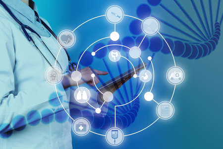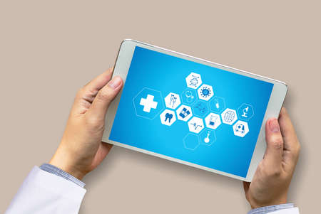 medical technology concept. Doctor holding tablet and illustration of different icons on light blue background