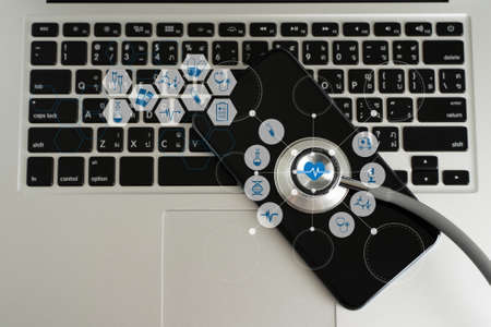 online telemedicine concept, stethoscope and pc keyboard with modern phone, medical app mock up